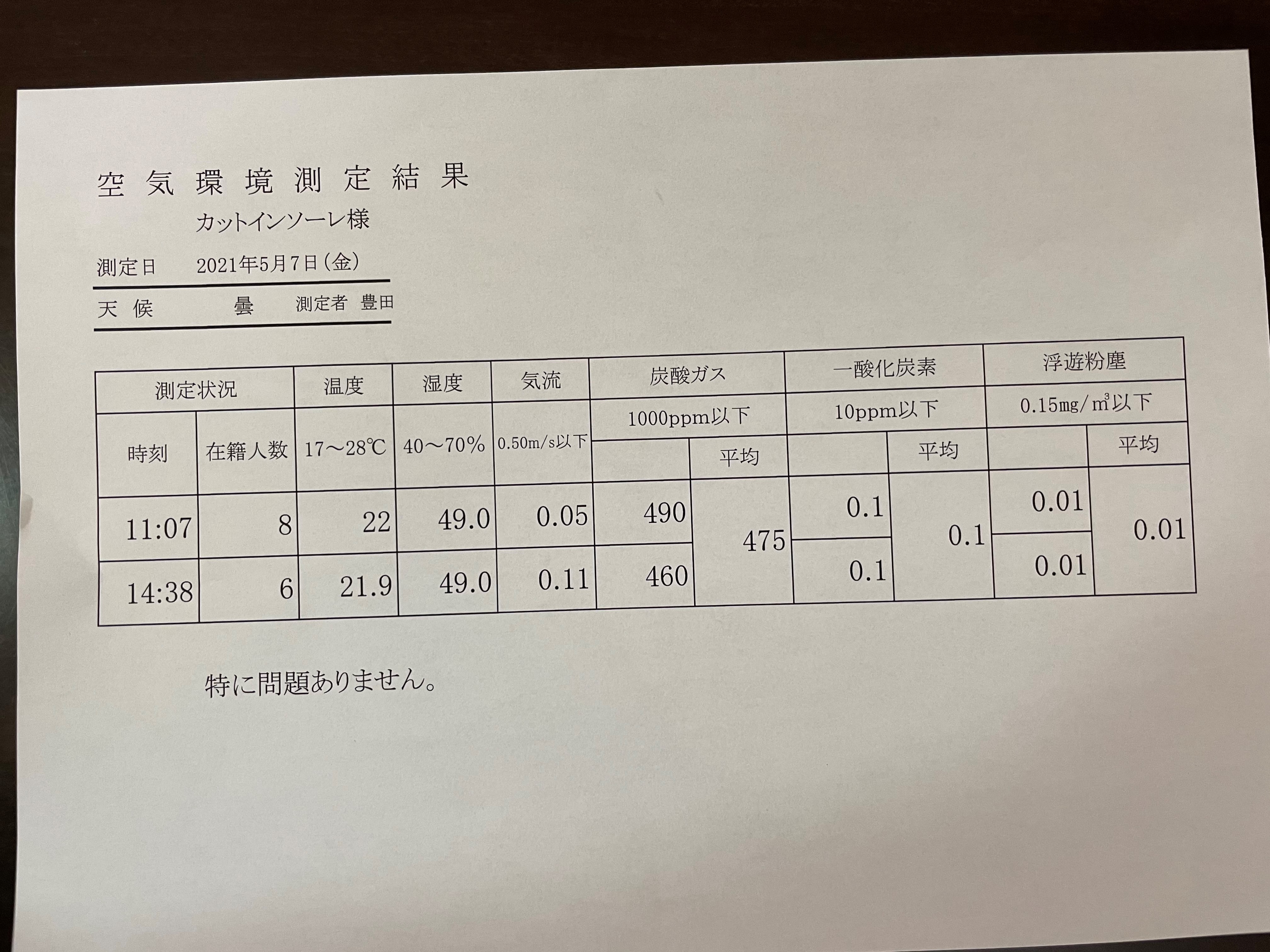 Home › 未分類 › 空気環境測定結果 空気環境測定結果 関連記事 コロナウイルス感染予防対策 環境測定 空気環境測定結果 2024 経営セミナー モード塾協会 空気環境測定結果 3月18日モード塾 空気環境測定結果